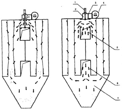 當(dāng)除塵器運(yùn)行阻力到一定值后,需對(duì)濾袋清灰。清灰工作狀態(tài),如圖8-3a所示。其工作過(guò)程如下:當(dāng)提升切換閥向下運(yùn)動(dòng),閥板在將出風(fēng)口關(guān)閉的同時(shí)打開(kāi)反吹風(fēng)口和截止閥,由于反吹風(fēng)機(jī)鼓入的氣流是與過(guò)濾氣流方向相反的逆氣流,改變了濾袋內(nèi)外的壓差,使濾袋由“膨脹”變“縮癟”狀態(tài),剝離濾袋內(nèi)表面附著的粉塵層。提升切換閥向上運(yùn)動(dòng),閥板在將出風(fēng)口打開(kāi)的同時(shí)關(guān)閉反吹風(fēng)口和截止閥,除塵濾袋重新“膨脹”,除塵器恢復(fù)到正常過(guò)濾狀態(tài)。