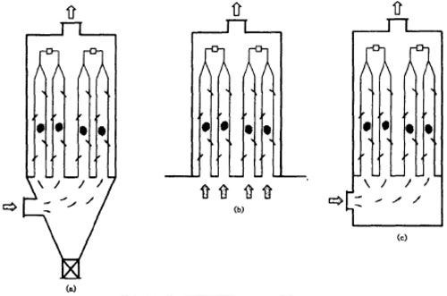 濾袋一般采用729滌綸除塵布袋或滌綸針刺氈,縫制成三袋聯(lián)體袋(也稱三聯(lián)袋),底部縫有彈性環(huán)使其能直接卡入花板孔中,頂部縫有相同材料的掛帶使其能將濾袋張緊和吊掛在搖桿上(見圖7-3)。過濾形式為內(nèi)濾式。工作時(shí)含塵氣體由濾袋下口進(jìn)入內(nèi)部;過濾后的清潔氣體經(jīng)袋室由排風(fēng)機(jī)排入大氣,清灰時(shí)先停止過濾工作,再啟動(dòng)搖動(dòng)清灰機(jī)構(gòu)進(jìn)行清灰。