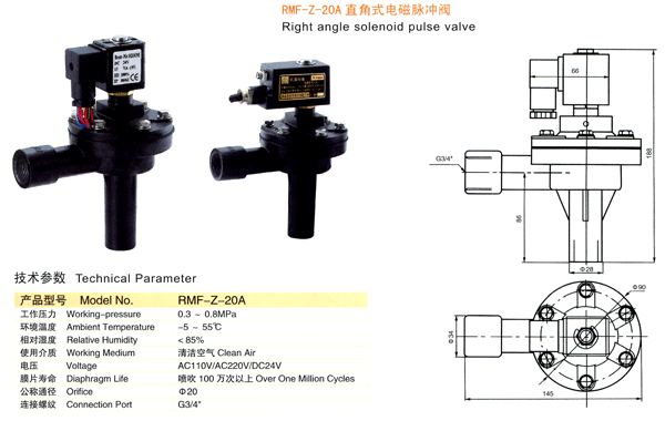 一、RMF-Z-20A-EX脈沖閥 電磁脈沖閥是脈沖袋式除塵設備中在低壓氣源壓力條件下使用的雙膜片快速脈沖閥。受脈沖噴吹控制儀輸出信號的控制,對濾袋逐排噴吹清灰,使除塵器的阻力保持在設定的范圍內(nèi),以保證除塵器的處理能力和收塵效率。 電磁脈沖閥 為直角式脈