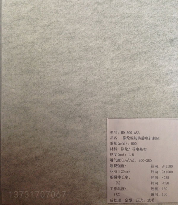 生產(chǎn)流程:纖維開松 --- 梳理 --- 疊網(wǎng) --- 予針刺 --- 主針刺 --- 軋光 --- 浸漬拒水防油工作液 --- 焙烘 --- 熱定型 --- 成品