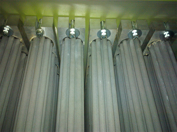 工業(yè)除塵技術(shù)的發(fā)展,由最早的水浴除塵--旋風(fēng)除塵--電除塵---袋式除塵器--塑燒板除塵器。管式除塵器是高效、長壽命的燒結(jié)濾芯與布袋除塵器的創(chuàng)新結(jié)合。燒結(jié)濾筒由PE(PA)(聚乙烯)多孔基材+PTFE(聚四氟乙烯)嵌入式涂層,純粹的表面過濾,高效耐磨的燒結(jié)