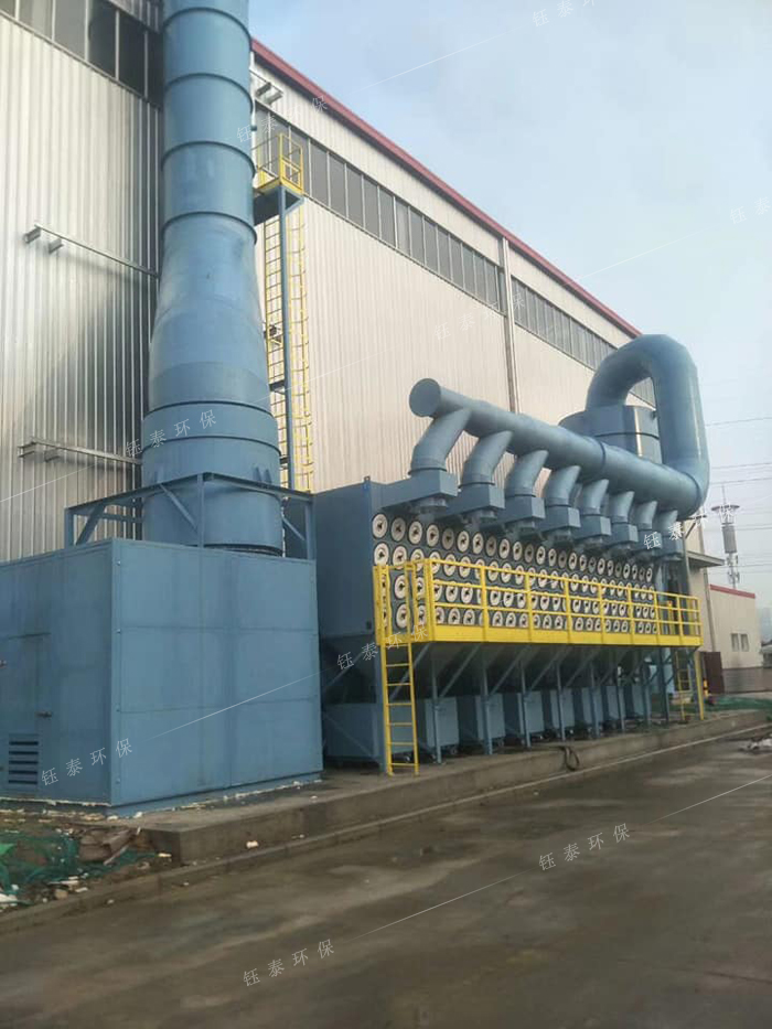 濾筒除塵器的主要構(gòu)造是由除塵室、脈沖反吹清灰系統(tǒng)和集塵室組成。當(dāng)含塵空氣進(jìn)入除塵室后,被圓筒形的濾筒材質(zhì)阻隔,亞微米以上的粉塵被阻留在濾筒外表面上,過(guò)濾凈化后的氣流就從濾筒