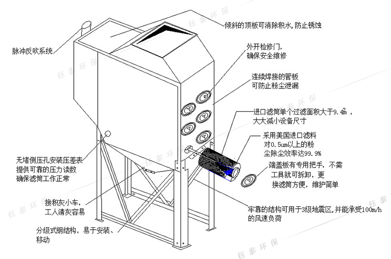 2.1、設(shè)備外型結(jié)構(gòu)特點(diǎn):整體結(jié)構(gòu)嚴(yán)密,連續(xù)焊接的管板可防止粉塵的泄露。設(shè)備機(jī)體采用酸洗除銹,底漆、面漆采用環(huán)氧漆噴涂,環(huán)氧漆附著力強(qiáng),涂膜柔韌耐磨,耐化學(xué)腐蝕性能優(yōu)良,有極好的耐水、耐油、耐酸堿、耐溶劑性。