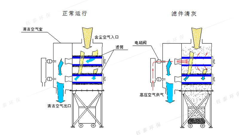 濾筒除塵器的主要構(gòu)造是由除塵室、脈沖反吹清灰系統(tǒng)和集塵室組成。當(dāng)含塵空氣進(jìn)入除塵室后,被圓筒形的濾筒材質(zhì)阻隔,亞微米以上的粉塵被阻留在濾筒外表面上,過(guò)濾凈化后的氣流就從濾筒中心排出。阻留在濾筒外表和濾筒上的粉塵,經(jīng)過(guò)一段時(shí)間的聚集,達(dá)到一定程度時(shí)由專門設(shè)置的PLC控制器控制的脈沖反吹閥開(kāi)始接受指令工作,按順序的對(duì)濾筒的氣流出口端向?yàn)V筒中心發(fā)出可調(diào)脈沖反吹,濾筒受到壓力達(dá)0.6Mpa的脈沖反吹氣流沖擊而震動(dòng),將附著在濾筒外表和濾筒上的粉塵抖落,使濾筒過(guò)濾凈化空氣的能力有順序的恢復(fù)到初始的狀態(tài)。